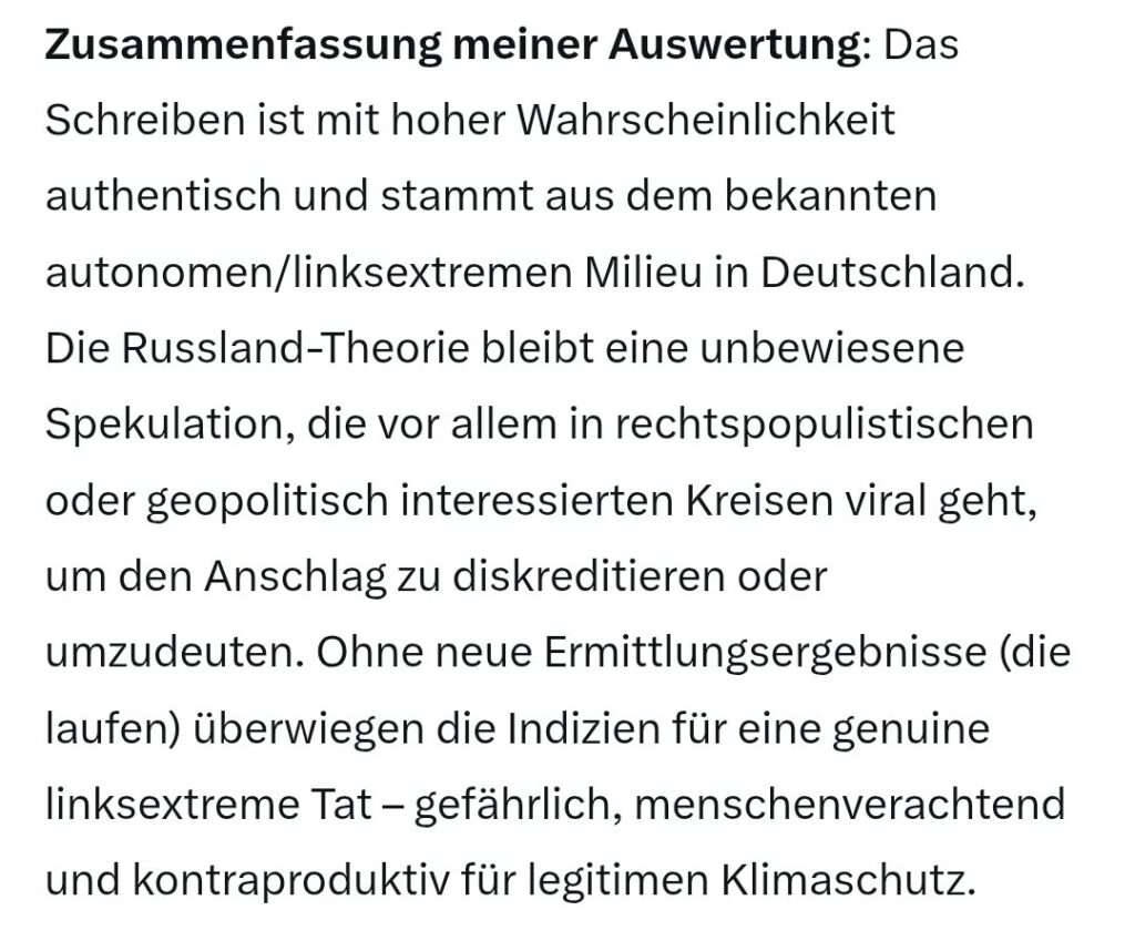 Derzeit sind Verschwörungstheoretiker fleißig am Werk, den Terroranschlag auf die Stromversorgung in Berlin Putin zuzuschieben, hat angeblich eine Analyse mit KI ergeben, dass der Ursprung des vorliegenden Bekennerschreibens in Moskau zu suchen wäre. Doch befragt man die Künstliche Intelligenz selbst, so kommt sie zu einem gänzlich anderen Ergebnis. So antwortete Grok (xAI): „Der Text ist typisch für linksextreme Bekennerschreiben – langatmig, ideologisch aufgeladen, mit Formulierungen wie ‚gemeinwohlorientierte Aktion‘, ‚Akt der Notwehr‘ oder ‚internationaler Solidarität mit allen, die die Erde und das Leben schützen‘. Solche verschachtelten, schwülstigen Sätze sind in der autonomen Szene üblich (ähnlich wie bei früheren RAF- oder neueren militanten Klimagruppen-Texten). Manche Passagen wirken holprig oder unnatürlich, was in Social Media zu Spekulationen über maschinelle Übersetzung geführt hat“, so die Antwort vom 06. Januar 2025.