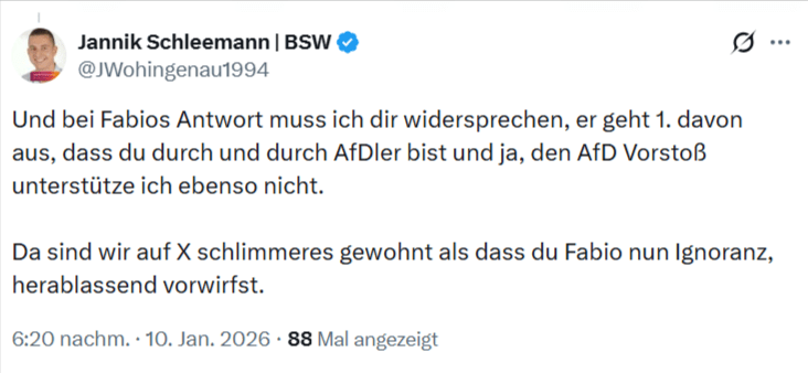 Antwort des BSW-Politikers Jannik Schleemann auf der Plattform X vom 10.01.2026
